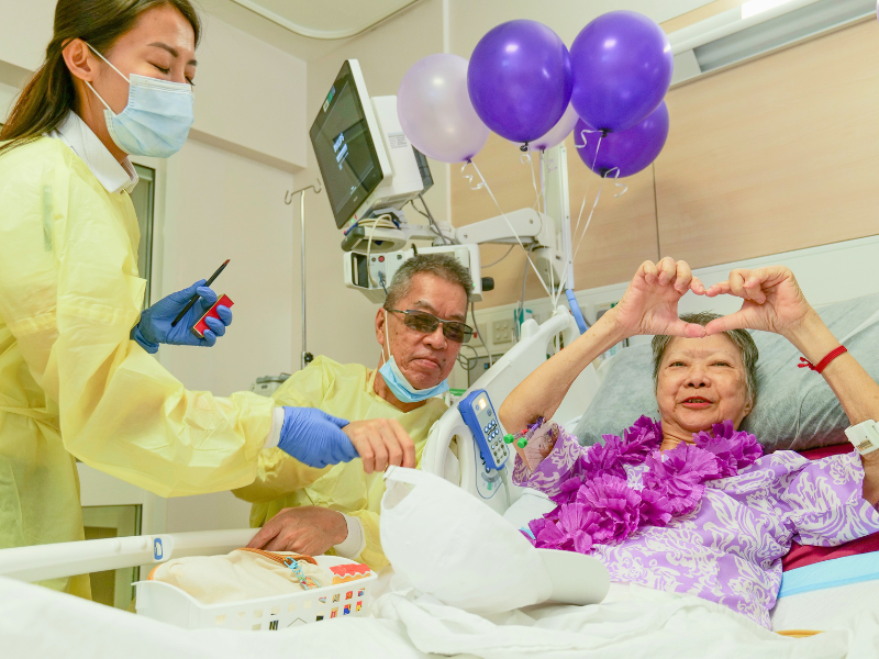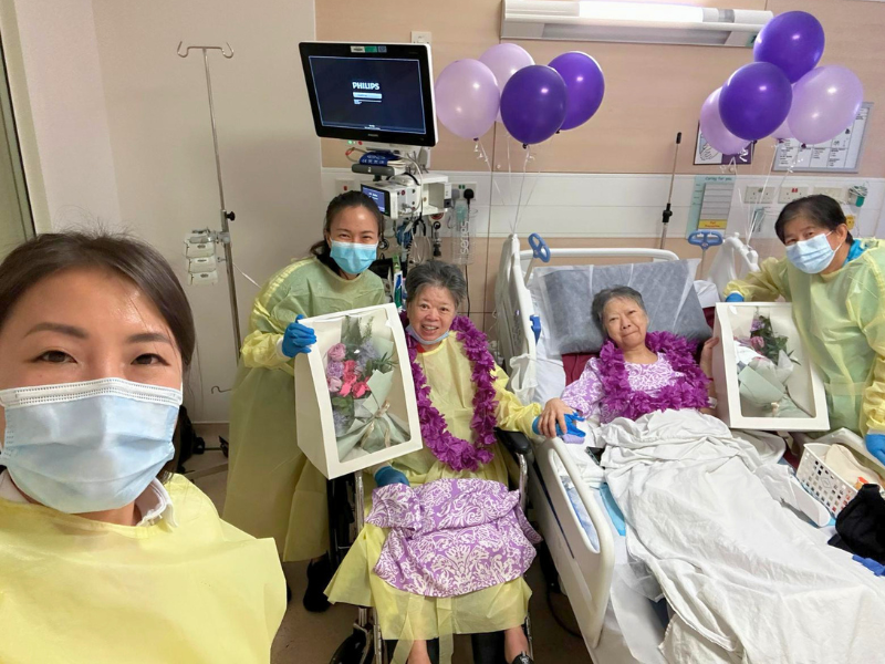 When we learned that Mdm Lim’s favourite colour was purple, we knew it had to be part of this special occasion. Our volunteers dressed the sisters in matching lilac outfits, adorned them with bright magenta flower garlands, prepared bouquets of amethyst-hued flowers from Hello Flowers! Singapore, and filled the ward with violet balloons to bring warmth and lightness to the space. They even helped Mdm Lim with a very light touch-up for the moment.